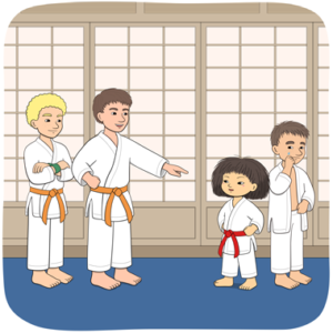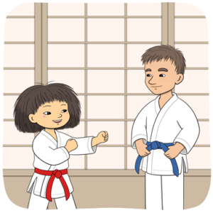 Minja och Mino går på karate på tisdagar. Idag är det tisdag. Minja och Mino går till dojon. Dojon är där man tränar karate.