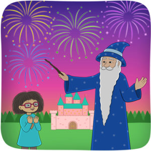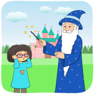Minja tar på sig ett par glasögon. Hon har fått dem av sin vän trollkarlen.