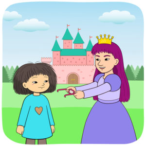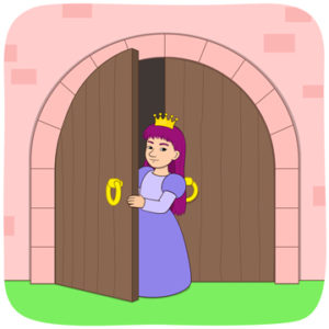 En prinsessa kommer ut ur det lilla slottet.